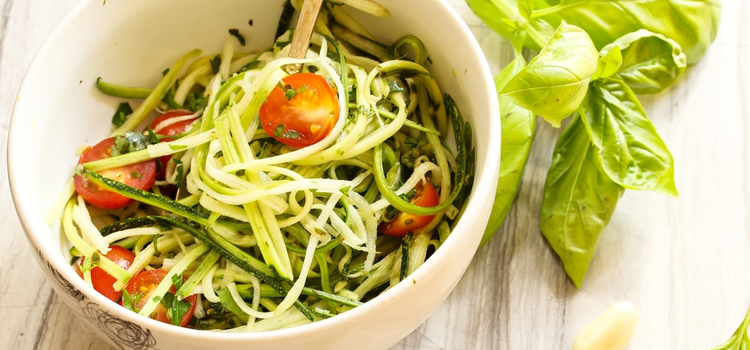 - Vend squashnudlerne med pestoen. Server med friske tomater. Værsgo!